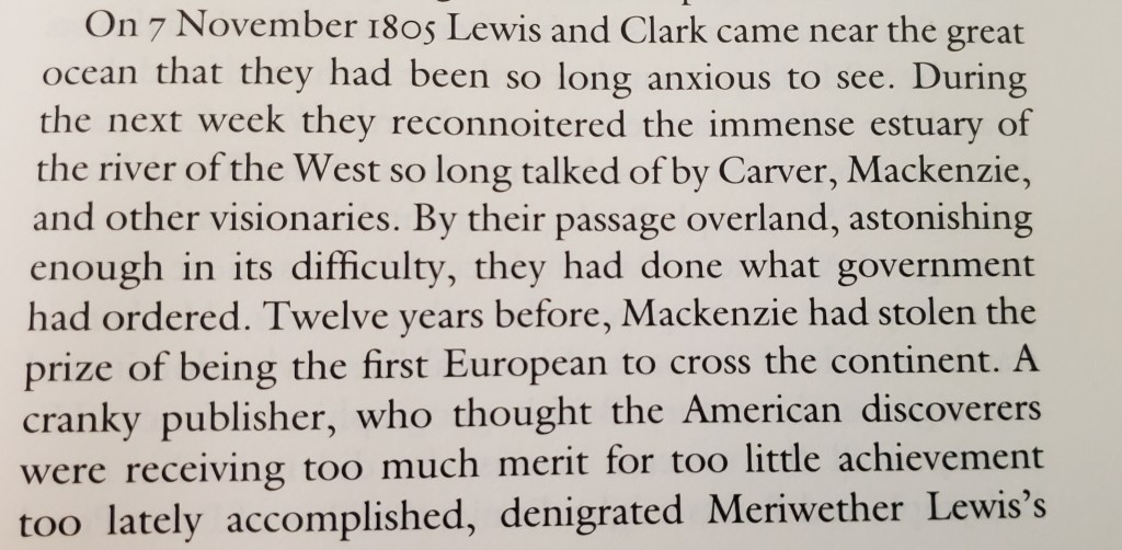 The book was great, of the three tellings of the journey I’ve read this was the best (though I’ve not yet read Mackenzie’s own From Montreal). But from the beginning it was not at all clear that the central thesis of the book was that Mackenzie was the first person to travel across North America by land north of Mexico. Instead, the central thesis seemed to be that Mackenzie’s journeys to the Arctic and Pacific oceans were primarily commercial ventures instead of ones driven by a sense of adventure. But nonetheless I pressed on.
