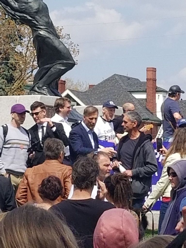 The third speech of the day was by far the most anticipated. Mr. Maxime Bernier (blurrily pictured) – who I happily voted for in the 2019 federal election – gave an excellent speech full of great “rights talk”. What was Bernier worried about? Our freedom is under attack. And surely it is! How free is someone if they cannot see their own mother for Mother’s day without fear of being arrested and ticketed? He went on to say that “every business is essential”. Again, wonderful. If you are the owner of a business or one of its employees, that income is likely damn essential for you. Bernier made clear that there were genuine medical concerns that we faced and that we ought to protect the vulnerable. Of course! As I have tried to emphasize. There is no need to be a COVID-denier to oppose lockdowns. Saying that, he interjected, “But, we need to reopen our economy”. Right again! Aren’t these restrictive lockdown a massive burden on productive actions? I would like to produce such and such good in such and such way, but I cannot because I fear being arrested. Or, I hope to exchange this good for some other good which I get greater satisfaction from, but I cannot because Ford will arrest the seller for selling it to me (while I thought that rugs and laptops might be essential during lockdowns, the Ford administration apparently disagrees to the great distress of my girlfriend and I who have needed both in the last two weeks). Finally, Bernier ends with a call to avoid a “show me your papers” society. On all fronts, great. We want freedom, the ability to work, a productive economy, and to stop government overreach. We do not need some heterodox “true” science to tell us that.